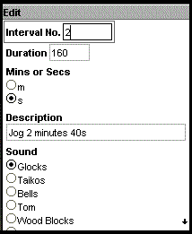 Multiple Sets: Several sets can be created. Each is managed independently and can be changed or deleted without affecting the other sets. The sets are shown in the main menu sorted alphabetically. Select "new" to create a new set, then "new" to define each interval. Use "Other settings" to define volume, countdown and other settings for the whole set. Use "edit" to change a set.