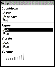 Countdown: Provides a visual and audio warning that a new interval is just about to start. Possible settings (configurable for each set independantly) are