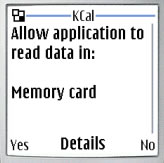 This is applicable if your phone allows Java applications to read from file (JSR-75), which many phones now do. KCal will be able to read the file hamper data directly from your phone's file system eg. on memory card or device's memory. This may depend on device and operating system limitations.Example Installation