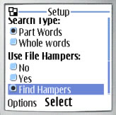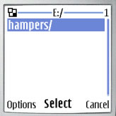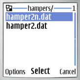 Use PC software supplied by your phone vendor (eg Nokia PC Suite, Sony Ericsson PC Suite, Motorola Phone Tools etc). More information on how to transfer files from PC to your phone can be found at the phone vendor's web site support pages or in your phone's user manual. Create a directory folder called "hampers" on your phone, eg on the memory card or phone device's memory. This can be in the root directory or in a subdirectory. Copy or transfer the seperate hamper files (eg. hamper2.dat and hamper2n.dat) into the "hampers" directory. |