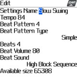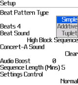 Change Beat Patterns: Upto 10 beat patterns are saved for quick access from the main screen. Select one of the Beat Patterns (Keep pressing '7' and then press '8' or FIRE to change. You can type the beat pattern as a string of numbers or choose the type and Beats seperately. You can save more by creating a Favourite setting.